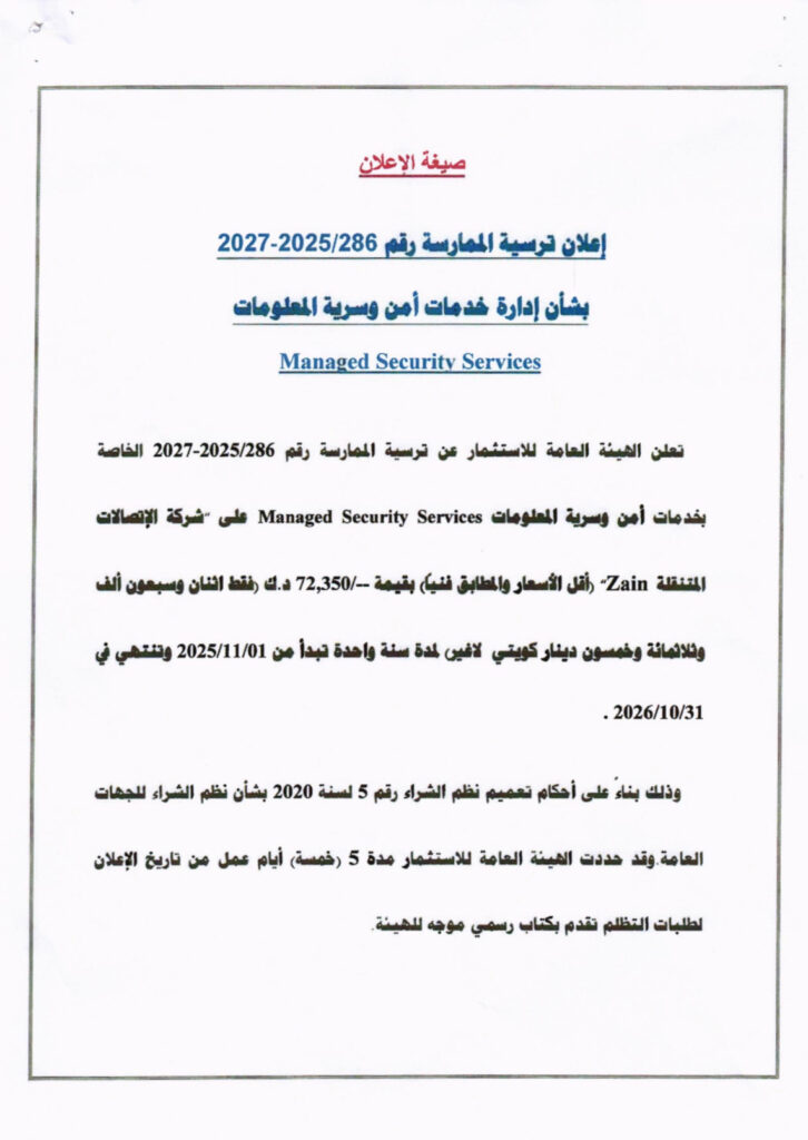 • إعلان ترسية ممارسة بشأن إدارة خدمات أمن وسرية المعلومات