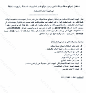 استغلال الموقع بصفة موقتة لتشغيل وإدارة موقع تقديم المشروبات الساخنة والوجبات الخفيفة في الهيئة Posted on 19 أكتوبر، 202520 أكتوبر، 2025تاريخ النشر 19 أكتوبر، 202520 أكتوبر، 2025 by Dalal Al-Refai الناشر Dalal Al-Refai استغلال الموقع بصفة موقتة لتشغيل وإدارة موقع تقديم المشروبات الساخنة والوجبات الخفيفة في الهيئة Posted on 19 أكتوبر، 202520 أكتوبر، 2025تاريخ النشر 19 أكتوبر، 202520 أكتوبر، 2025 by Dalal Al-Refai الناشر Dalal Al-Refai