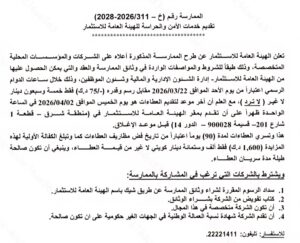 ممارسة تقديم خدمات الأمن والحراسة للهيئة العامة للاستثمار Posted on 22 March، 202622 March، 2026تاريخ النشر 22 March، 202622 March، 2026 by Manar الناشر Manar ممارسة تقديم خدمات الأمن والحراسة للهيئة العامة للاستثمار Posted on 22 March، 202622 March، 2026تاريخ النشر 22 March، 202622 March، 2026 by Manar الناشر Manar